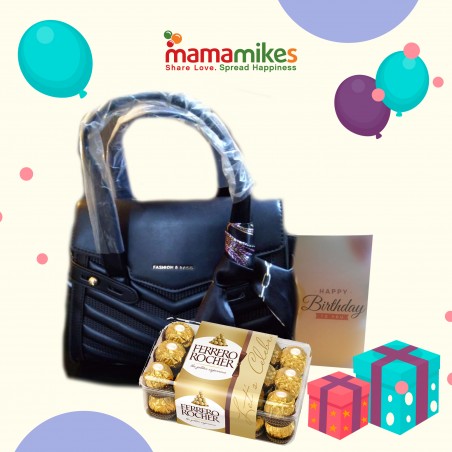 Classy hand bag, Ferrero chocolates and a Birthday card